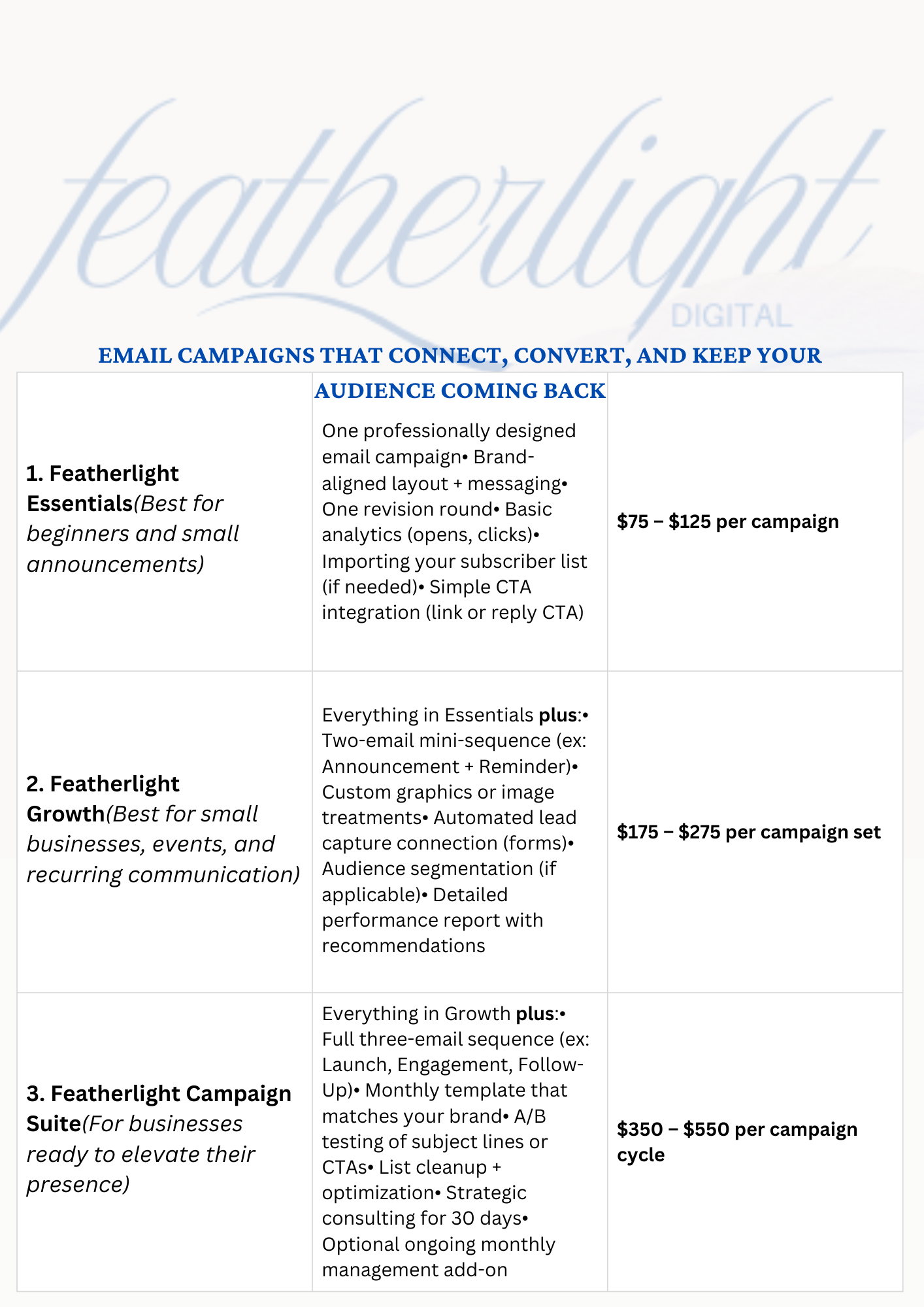 Featherlight Digital builds story-driven landing pages and email foundations — without overwhelm, jargon, or endless revisions.